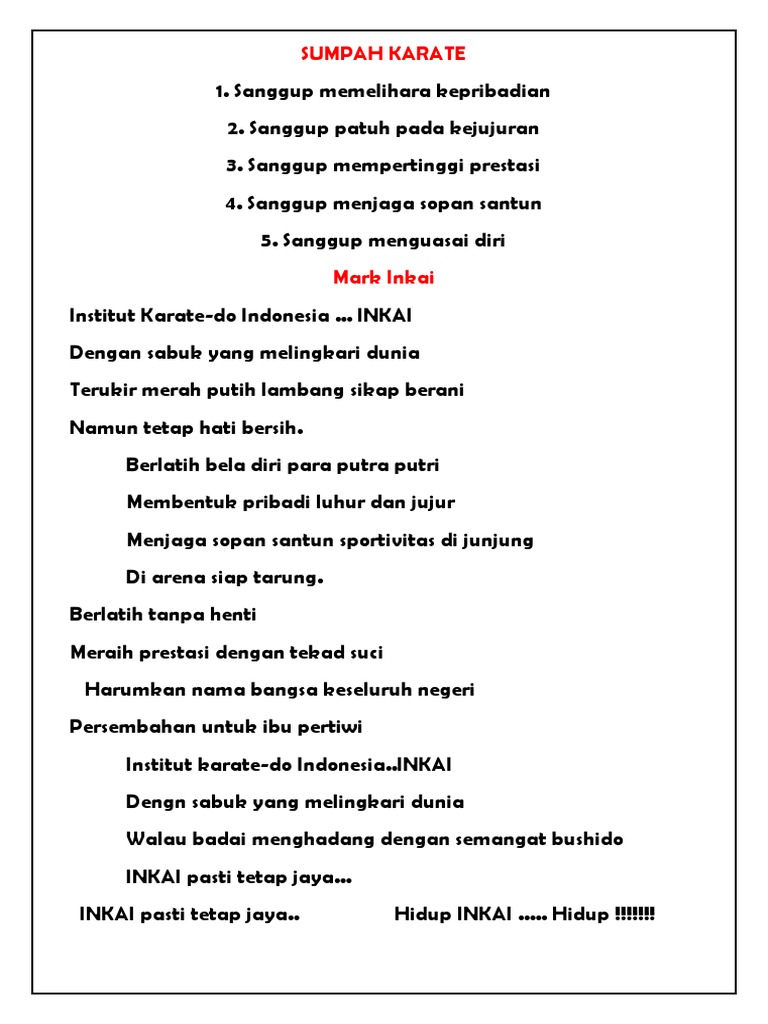 Institut Karate Do Indonesia Inkai ह म प ठFacebook from lookaside.fbsbx.com Bentuk bulat melambangkan persatuan dan kesatuan yang universal dan memberi arti bahwa olahraga karate yang dibina lemkari dilandasi semangat revolusi 17 agustus 1945 dan pancasila. Apr 20, 2016 · medan, (analisa). Jun 02, 2014 · sumpah karate 1. Apr 06, 2013 · pegertian dan arti lambang lemkari, tingkatan sabuk, sumpah karate, beseta istilah dalam karate lemkari lembaga karate indonesia 1. Jika latihan dua kali dalam seminggu, berarti seminggu empat kali mengucap sumpah. Sumpah karate diucapkan saat upacara tradisi karate, di awal dan akhir latihan. Jun 02, 2014 · arti lambang lemkari. 4.sumpah karate :1)sanggup memelihara kepribadian2)sanggup patuh pada kejujuran3)sanggup mempertinggi prestasi4)sanggup menjaga sopan santun5)sanggup menguasai diri 5.lemkari :