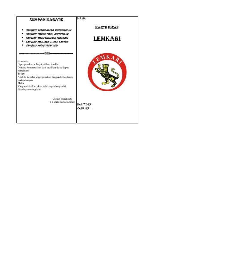 4.sumpah karate :1)sanggup memelihara kepribadian2)sanggup patuh pada kejujuran3)sanggup mempertinggi prestasi4)sanggup menjaga sopan santun5)sanggup menguasai diri 5.lemkari : Gambar harimau dalam posisi siap menerkam. "kegiatan ini sebagai aplikasi dari salah satu sumpah karate, yakni sanggup memelihara kepribadian. Seorang karateka pantang berbohong, jujur pada diri sendiri dan orang lain, sehingga dapat dipercaya semua orang. Jun 02, 2014 · arti lambang lemkari.